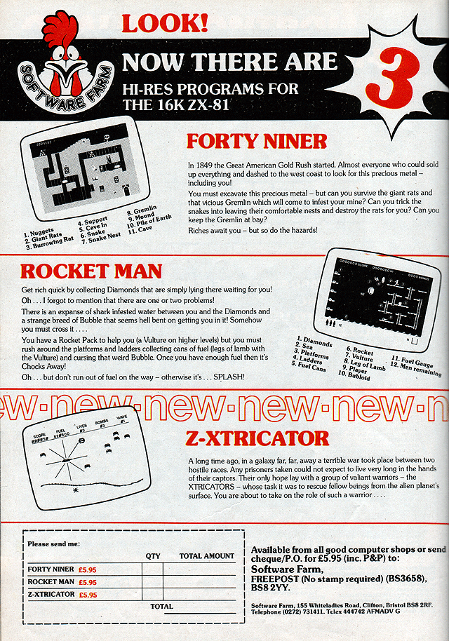 The advert was by the, then, mysterious ‘Softwarwe Farm’ and promised ‘hi-res’ graphics on the ZX81… a machine that everyone knew couldn’t do user-defined hi-res graphics, and I have to admit that I was sceptical.
